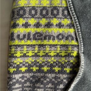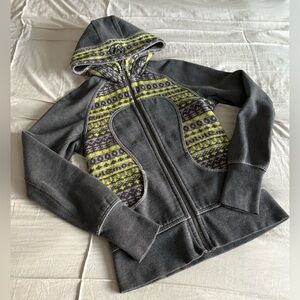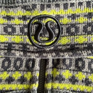 This Lululemon Scuba Hoodie Special Edition is a cozy, hard-to-find piece featuring a striking Fair Isle knit pattern with pops of neon yellow against a classic gray base.