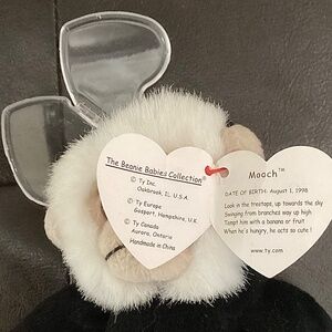 White fur around his face, brown bead eyes, embroidered eyebrows, nose & mouth