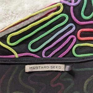 Black mesh crop top from Mustard Seed with unique textured multicolour squiggles. Would make an awesome Pride shirt with bike or jean shorts. Or pair with a black bandeau for a really cool look.