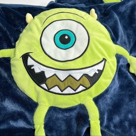 LIMITED EDITION 2013 RARE Set of 2 Disney Pixar Monsters Inc. Mike Wazowski navy blue fuzzy plush pillow case. This was a premium promotional item from Kellogg's and a limited edition. Bright lime green Mike Wazowski green monster from Monsters, Inc. and Monsters University. 3-dimensional pillowcase with the legs, hands and horns standing proud outside of the pillowcase and Mike's body filled out like a plushie. Mike even has his retainer. Slit opening in the back for a standard pillow case. Deep nacy blue color around Mike in a fuzzy cozy material. The tags said "Wash separately. Gentle cycle - cold/cold. Air dry flat." but were removed so they wouldn't stick out. In really geat used consition with very minor signs of wear. Please see photos and video for measurements and details. These would look SO cute on your monster-loving kids bed all made up!
