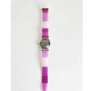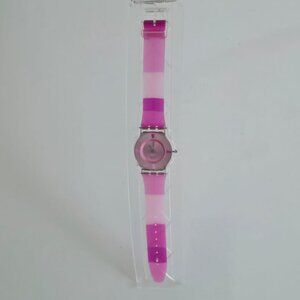 The rare Swatch Skin PINKYPINK from the year 2004 from the flattest watch series in the world is a real eye-catcher due to its stripes in various shades of pink and pink. It appeared in the spring/summer collection 2004 and has a striped silicone strap. The shimmering pink dial with silver hands is surrounded by a transparent case. The watch has a precision quartz movement with battery.