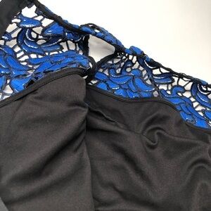 EXTREMELY RARE! Self-Portrait cobalt blue floral lace mini dress. This rare form fitting beauty is a luxurious beautiful dress in person!! It is crafted in such a high quality way. Perfect for a date night out, girls dinner out or as a wedding guest. Stretchy black inner lining (thick outter lace is not stretchy). Hidden zipper up the back. In excellent pristine used condition with the only flaw being that the inside brand tag/size tag was removed as it was visible when wearing & the care tag is miss labelled as a "Fine Lace Wrap Top". See photos and video for measurements and details. **Please measure your own clothing to determine if this will be the right fit since it is missing the size tag. Women's size SMALL (4/6).