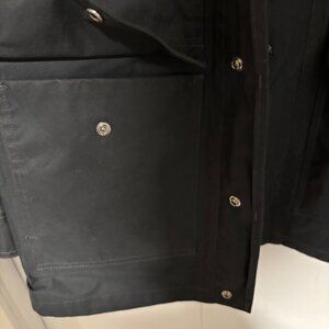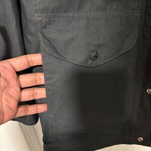 A rare waterproof cruiser style Filson, made in the USA. No fabric tag, but feels like polyester/nylon. Has taped seams. Lightweight and utilitarian, with 3 outer pockets as well as handwarmer pockets below the waist pockets. Also features a game pocket at the back. Zipper closure as well as a snap button storm flap with snap buttons. The colour is a dark charcoal grey.
