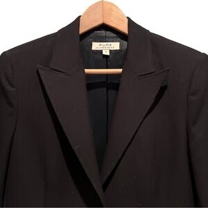 This ALFRED SUNG PURE Women’s Black Blazer in Size 8 is a classic wardrobe essential. Featuring a two-button closure, this lined blazer has a sleek design with front pockets for added functionality. The tone-on-tone pattern adds a subtle touch of sophistication to the black fabric, making it versatile for both professional and casual settings. It’s in great shape, with a tailored fit that flatters any silhouette. Perfect for adding a polished finish to your outfits!