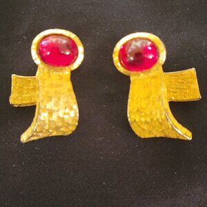 Gorgeous textured goldtone clip earrings with big red cabuchon stones.