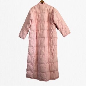 This RARE L.L. Bean long jacket features a soft pastel pink color and a quilted texture for added warmth. With long sleeves and a high standing collar, it is designed to keep you cozy during chilly days.