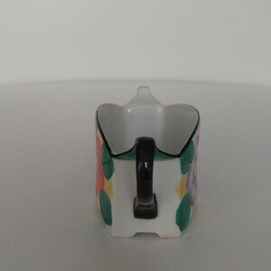 It's small but carries great beauty: Fine porcelain china, hand painted, vibrant floral pattern & colour--different on each side, double handles, footed