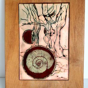 RARE VTG Hungarian Art Ammonite Fossil Image in Abalone Abstract Forest Etching