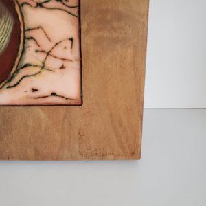 This is a significant vintage piece created in 1988, over 35 years ago. The image contents are timeless: ammonite shell fossil, abalone shell, forest, wood frame.