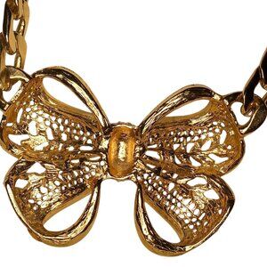 RARE Vintage 70s Gold Tone Bow Necklace Chunky Choker Rhinestone Pearls Filigree
