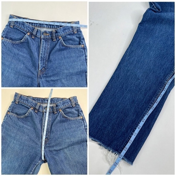 RARE FIND! Vintage 70s Orange Tab Levi's 619 high waisted dark blue stonewashed jeans. They are a unique pair of 619s as they were professionally cropped with a raw hem (24" inseam); as was the style in the 70s. The perfect vintage one-of-a-kind pair of custom jeans from the 1970s! Orange Levi's tab on the back pocket. In amazing vintage used condition with the only flaws being one small run near the bottom of one leg (see photo pointing to it) and some dark blue color transfer on the back brown leather tag. Please see photos for measurements and details. Women's size 31/32.
