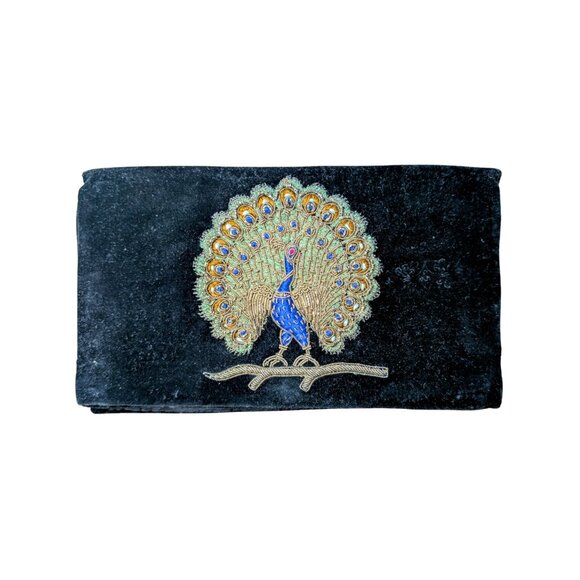 Vintage Clutch • Zardozi Embroidery • Peacock Design • Black Velvet Bag • Hand Embroidered • Indian Textile Art • Metallic Threadwork • Evening Purse • Statement Accessory • Boho Luxe • Ornate Detail • Rare Vintage • Collectible Accessory • Peacock Colours