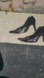 These sophisticated Italian black patent leather heels feature a sleek stiletto design with a box toe, perfect for dressy or formal occasions.