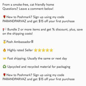 >>>>🤔🤔 No Poshmark account? No Problem!!! 🤩🤩🤩 Sign up using the following code: 👉PARANDPARVAZ 👈 to receive $15 credit towards your first purchase on Poshmark!!!😉😊<<<<
