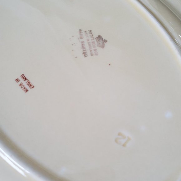 Marked '12' Made in England by Myott & Son Company | Deep creme colour with pink painted band trim and thin brown / black on the outer scalloped rim | Pre-owned, good condition with some vintage wear on the rim & trim gold & pink accents but in relatively good condition with no chips or cracks | A very nice MCM older piece to add to your vintage collection | https://www.myottcollectorsclub.com/story.html | Measurements: 14.5" x 11.5"