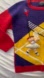Features: Stuffed 3D tennis player appliqués, bold primary color blocking (purple, red, yellow), chunky crewneck knit.