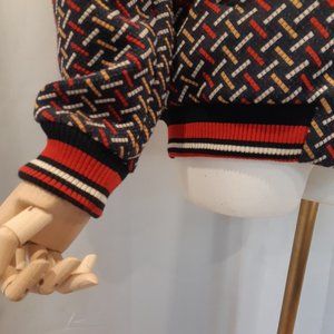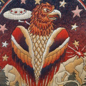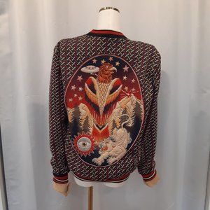 RARE Zara mens jacquard tapestry bomber jacket with quilted details on the front and back with eagle, spaceship, stars, eye, cat, mountains and trees. Really an amazing piece! Made in Turkey. Blue, red, cream and gold in colour. Has two side pockets and green silky lining, size small. Good as a unisex item, great pre loved condition. The inside seam on the one side was repaired (see pics). From a smoke free home.