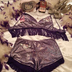 rare gorgeous custom fringe shorts and top cut from expensive quality hologram swimsuit fabric with winged hello kitty logo and crystal details they come with cute metal hello kitty necklace and crystal hello kitty earings so you will really sparkle! see my closet for tons more hello kitty custom treasures alsways open to offers and if you like more than one make a bundle offer!