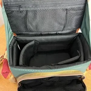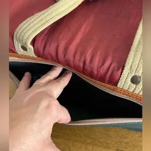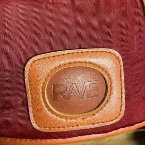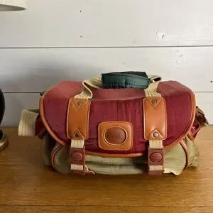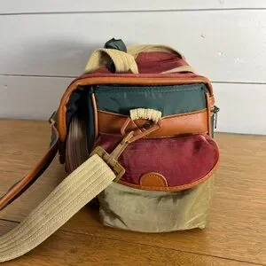 Vintage-inspired camera bag by RAVE featuring a durable canvas body with faux leather accents. Multi-color design in warm earthy tones. Adjustable shoulder strap and top handle for versatile carry. Structured interior with padded compartments and multiple zippered mesh pockets, ideal for camera gear or everyday essentials. Clean interior and hardware in excellent condition.
