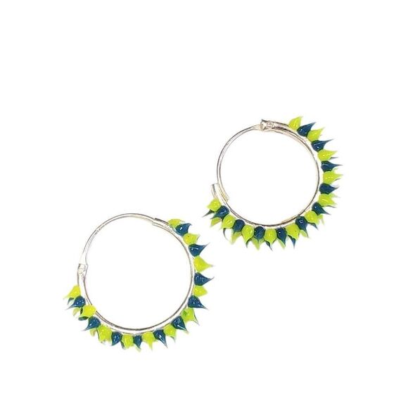 Throwback sterling silver earrings with neon yellow and blue rubber spikes. Hinged hoop closure.