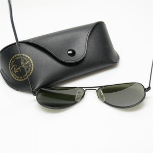 Details: Aviator frame shape, Polished black metal frame, Black temples, Adjustable nose pads, Solid colour green lens, Genuine Ray Ban case made in Italy, RayBan logo on left lens, RB etched logo on right lens
