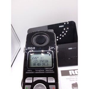 RCA ViSYS 4 Line Business Cordless Office Phone model TC25420. Features: intercom, call transfer, call waiting, caller id, call conferencing, backlit LCD, do not disturb, 50 name/number memory, handset volume control, one-touch redial, flash function, hold function, headset jack, hearing aid compatible and is expandable to 16 devices. Includes base station with handset, handset battery, 2 phone cords, power adapter, French instructions and box. English instructions can be found online. Box shows some wear.
