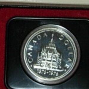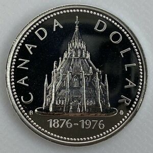 1876-1976 Canadian Specimen Silver Dollar the 1976 silver dollar commemorates the 100th anniversary of the completion of the library of Parliament.