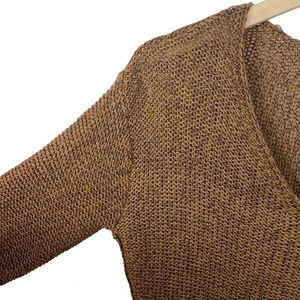 In excellent condition from RDI, a lightweight v-neck sweater with faux suede elbow patches. Marled brown with black flecks. Long dolman sleeves. Loose knit.