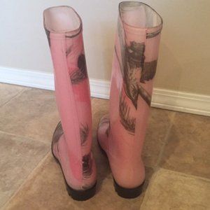 Pink camo'esque rain boots (or gum boots if you are of a certain age😉), size 8 in very good condition. They are ~12" tall (not including the heel), the bottom sole is ~10" from toe to heel and the top measures ~15" around.