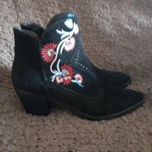 A darling flora embroidery covers this classic ankle boot and enhances it's bohemian aesthetic.