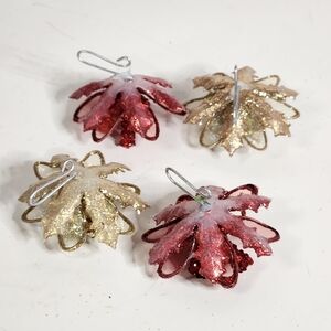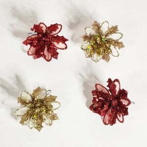 RED AND GOLD GLITTER FLOWER ORNAMENTS SET OF 4