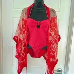 RED ONE PIECE BATHING SUIT BACKLESS WITH BACK STRAP NECK TIE SIZE SMALL