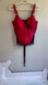 Red satiny bustier with sheer mesh back & ribbon laced adjustable corset back. The straps have square rhinestone embellishments on the front, black lace trim at the bottom and faux wrap bust. There is slight padding to hold form and shaped in a synthetic stretch fabric.