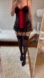 Black & red negligee with padded formed bust, underwire, sheer black fabric with ruffled hem, red strip with tiny dots at the front, 4 garter straps, adjustable straps, eye & hook back closure featuring a small orb encrusted with rhinestones at the bust.
