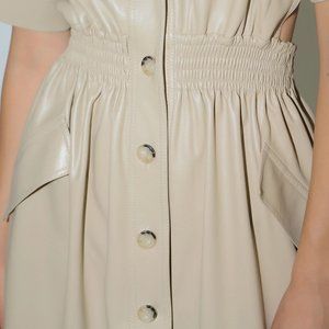 Soft eco leather red button down coat. Long sleeves and functional pockets. Built-in elasticized waistband. Unlined.