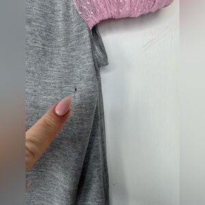 Classic heather gray body with feminine pink puffed sleeves in sheer dotted tulle.