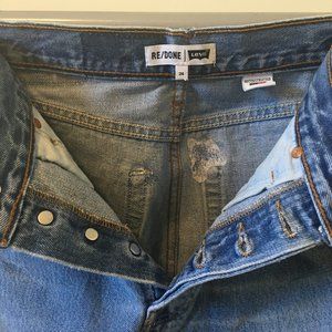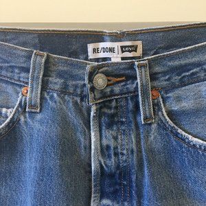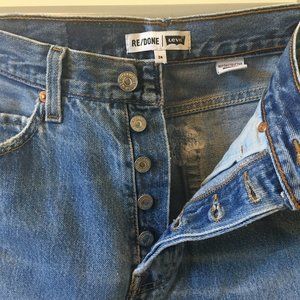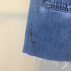 The RE/DONE High Rise Mini Skirt, made from repurposed vintage Levi's jeans, sits at your waist, maintaining its classic five-pocket style, and finishes at your mid-thigh with a raw hem. The shape of the skirt flatters where you want it to with the help of side darts. The faded button fly and other signs of wear make this one-of-a-kind mini your girly go-to for the summer. The skirt is made from vintage levi, so the stain mark is apart of the original denim.