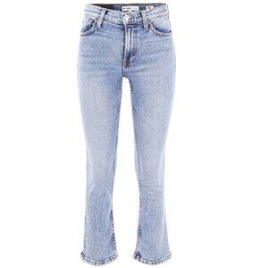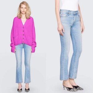 Kick Flare High Rise Jeans by RE/DONE in Women's Size 25 in MID90s Wash (medium-light blue). Stretch cotton denim jeans with concealed zip closure. Feature a leather logo label on the back and contrast seams. 96% cotton, 3% PES and 1% elastane. Machine washable. Excellent like new condition. No flaws.