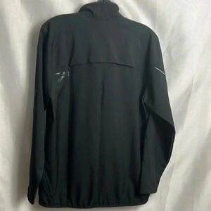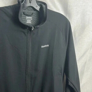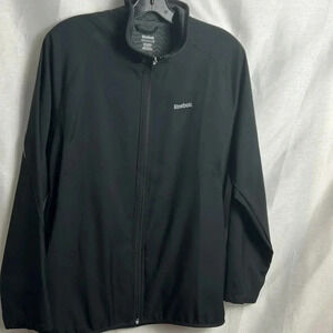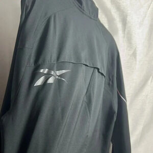 Like new condition , no sign of wear but no tags . No flaws to report . Excellent condition . 2 slanted side pockets Vented in the top part in the back . Embellished zipper with Reebok on it . Graphic logo on back , Reebok on front White line one on sleeve . Elastic at bottom hem . Smoke free pet free home (269)