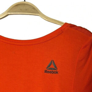 REEBOK. Orange activewear tee shirt . Logos ,scoop neckline , longer cap sleeve