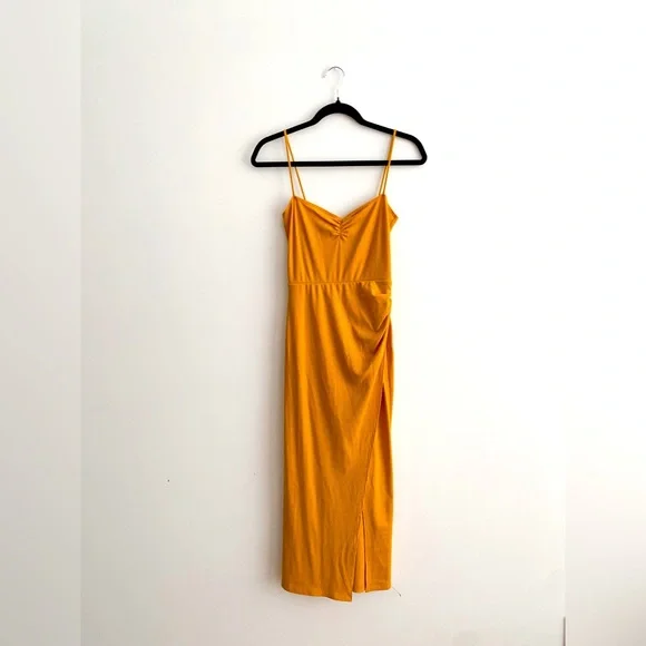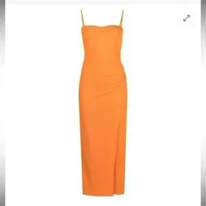Formosa knitted midi dress from Reformation featuring sunset orange, TENCEL™ Lyocell, ruched detailing, sweetheart neck, spaghetti straps, side slit, straight hem and mid-length.