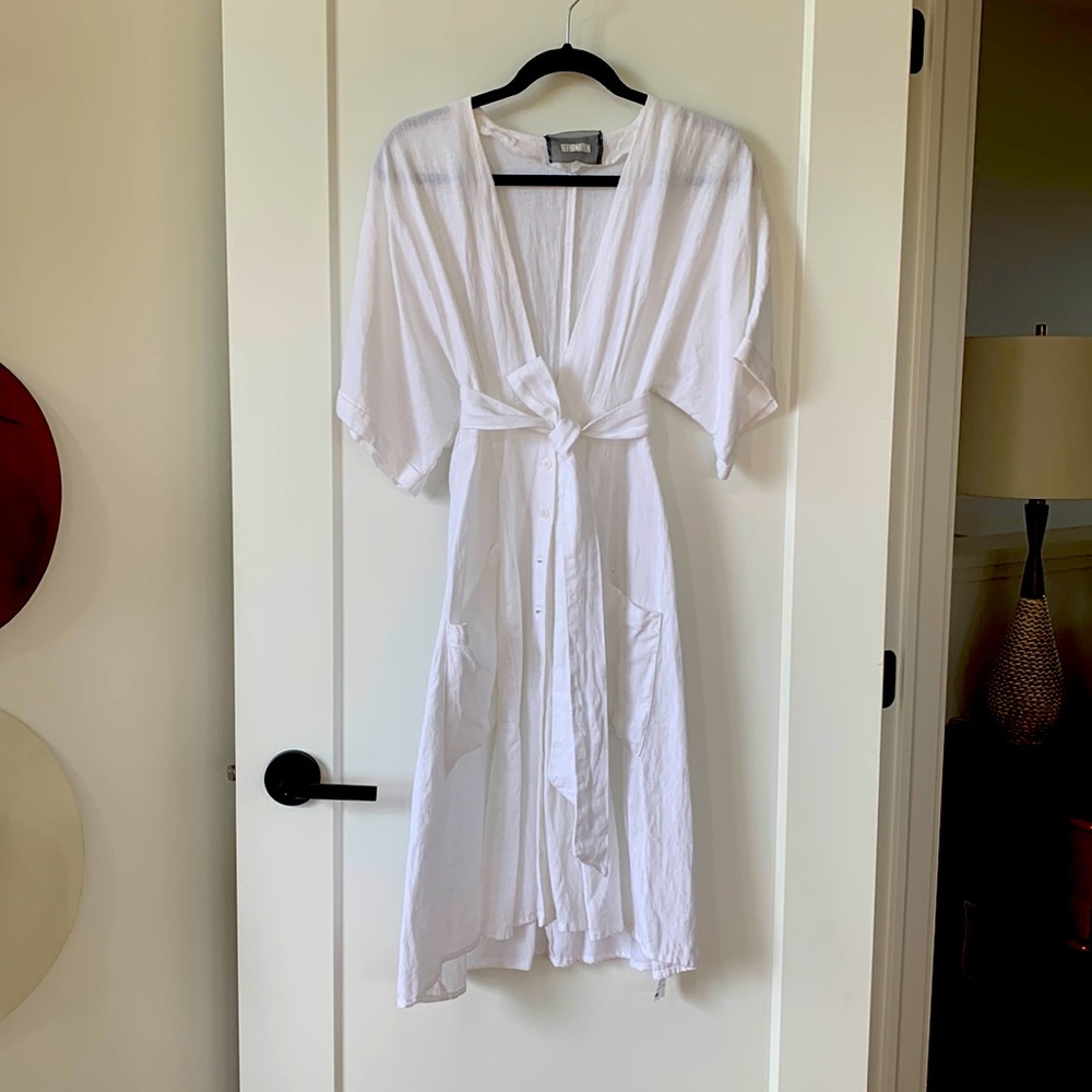 100% percent linen, deep plunge V (no modesty closure), cuffed dolman sleeves, apron pockets button front. Never worn!