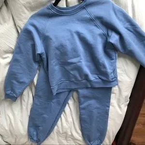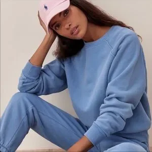Reformation’s classic crew neck sweatshirt and matching sweatpants in Morning Glory.