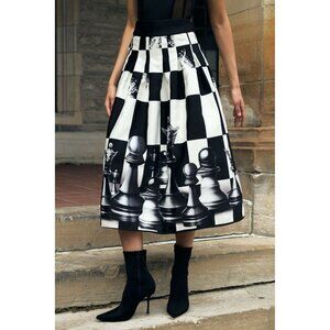 Midi length with a bold chess-patterned print