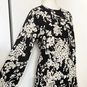 REISS GABRIELLA BLACK WHITE FLORAL LONG SLEEVE MINI DRESS, this is a chic black and white trendy fashion floral long sleeve mini dress in an a-line skater-like style with a crewneckline - back zip and lined - not stretch and in a fit & flare / a-line style. The Gabriella dress is printed with a black-and-ecru floral design that suits the weeks between seasons perfectly. The cut is flattering, feminine and works best with strappy black sandals and add a tote bag for a pulled-together look. Cocktail party spring and summer classy chic contemporary perfect dess with strappy sandals or classic pumps.