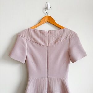 Polished and feminine, the REISS Hazel dress is crafted from a softly structured knit with tonal texture blocking for subtle dimension. The elegant blush hue, short sleeves, and seamed paneling create a flattering silhouette, finished with a softly flared hem for just the right amount of movement. Perfect for work events, weddings, or any elevated occasion.