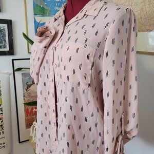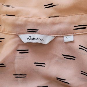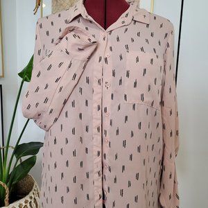 Another Reitmans classic in a soft and hard-to-wrinkle drapey fabric perfect for work. Soft pink with a modern pattern, this blouse also has sleeve button detail to tie up your sleeves or leave them buttoned down. Smooth enough to wear under a sweater without bunching while the weather is still cool.