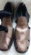 a pair of metallic bronze or copper-colored women's closed-toe sandals or flats.