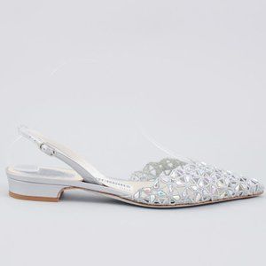 Rene Caovilla Silver Crystal Stones Sophia Flats. Pointed toe. Ankle strap with buckle closure. Sparkly bottoms. Tonal stitching.