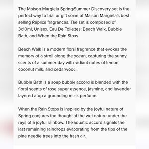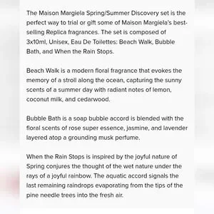 The Maison Margiela Spring/Summer Discovery set is the perfect way to trial or gift some of Maison Margiela’s best-selling Replica scents. The set is composed of 3x10ml, Unisex, Eau De Toilettes: Beach Walk, Bubble Bath, and When the Rain Stops.